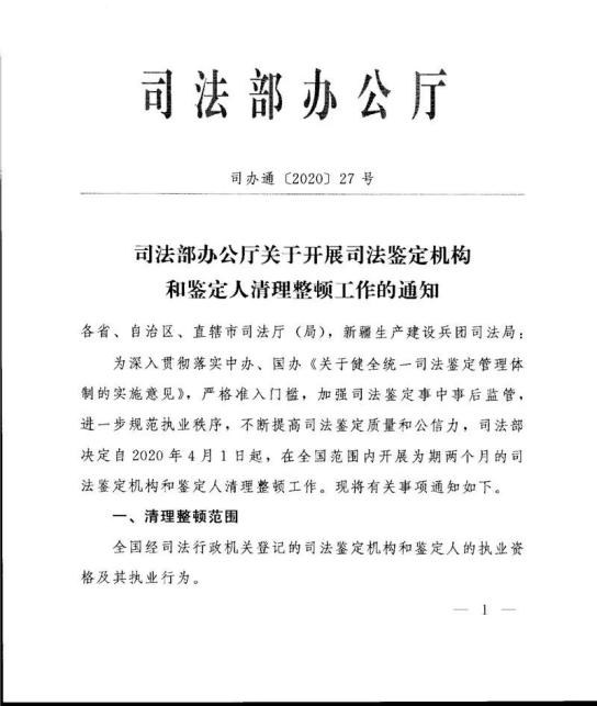 原标题:《【通知】司法部办公厅关于开展司法鉴定机构和鉴定人清理整顿工作的通知》