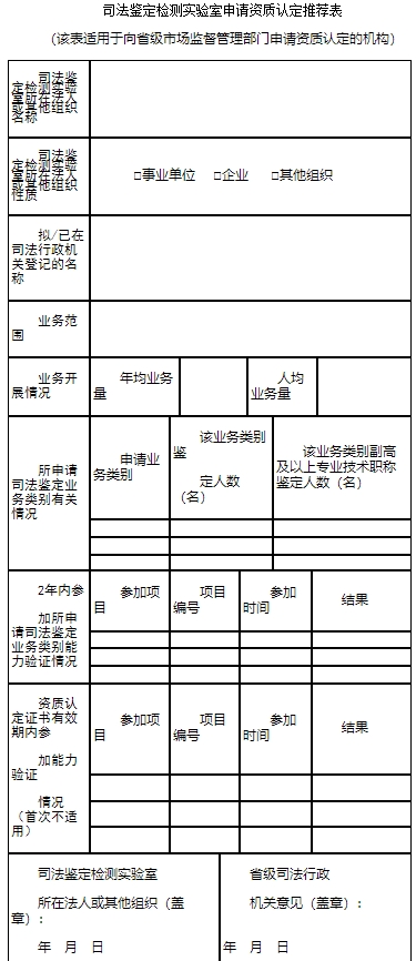 二、从事法医物证、法医毒物、微量物证、环境损害之外其他司法鉴定业务的检测实验室,可以其设立的法人或者其他组织的名义申请资质认定。已取得《司法鉴定许可证》的司法鉴定机构的检测实验室,由司法行政机关推荐,向市场监督管理部门申请资质认定。未经司法行政机关登记的法人或者其他组织拟开展法医物证、法医毒物、微量物证、环境损害之外其他业务所需的检测实验室需要申请资质认定的,向市场监督管理部门申请资质认定。